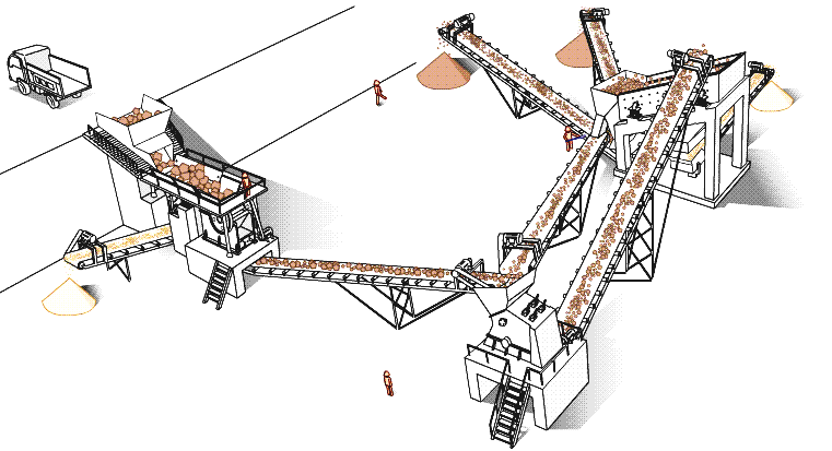 配置:原料倉、ZSW490×130振動給料機、PE1000×1200顎式破碎機、PF1820反擊式破碎機、3YK2870振動篩(2臺)、MTK-500制砂機、2914洗砂機、若干條輸送機等