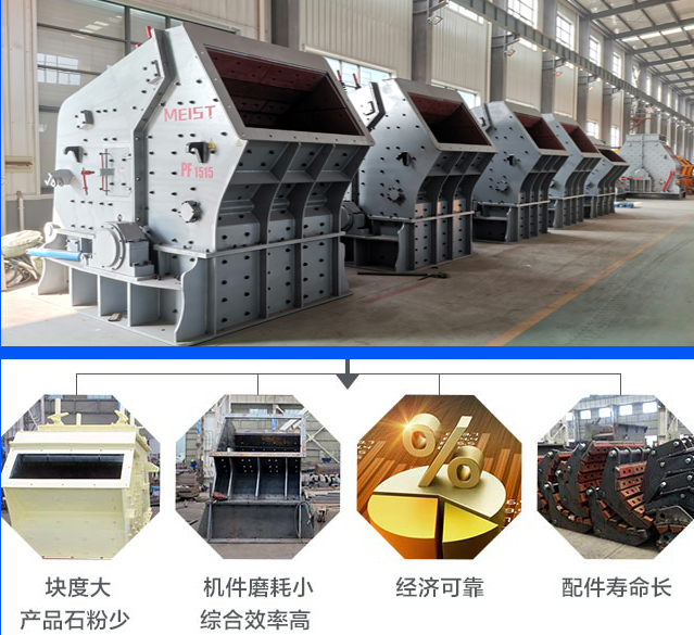 二破設備,反擊式破碎機進料口大、破碎腔高,適于破碎硬度大、塊度大的物料,產(chǎn)品石粉少,反擊板與板錘間隙能方便調(diào)節(jié),有效控制出料粒度,顆粒形狀好,結(jié)構(gòu)緊湊、機器剛性強、轉(zhuǎn)子具有大的轉(zhuǎn)動慣量。