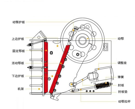 調(diào)整排料口時(shí)先松開(kāi)T型螺栓,接著用液壓起頂機(jī)或起頂螺栓頂開(kāi)調(diào)整座,換入所需厚度的墊片,然后退出液壓起頂機(jī)或起頂螺栓。動(dòng)顎借自重和彈簧的作用力,自動(dòng)壓緊墊片組,并使調(diào)整座緊貼耳座,最后鎖緊調(diào)整座和墊片組。