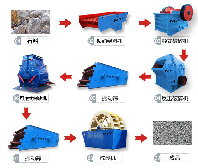 3、給料機(jī)+錘破+反擊破+制砂機(jī)+振動(dòng)篩