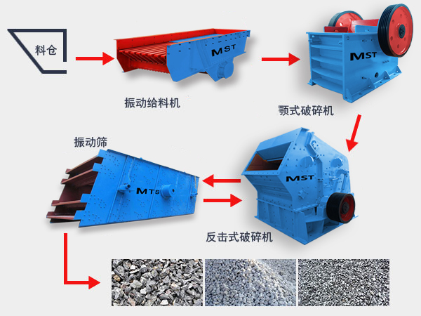 1、大塊的石灰石原料經(jīng)料倉由振動給料機均勻地送進一破(顎式破碎機)進行粗碎;