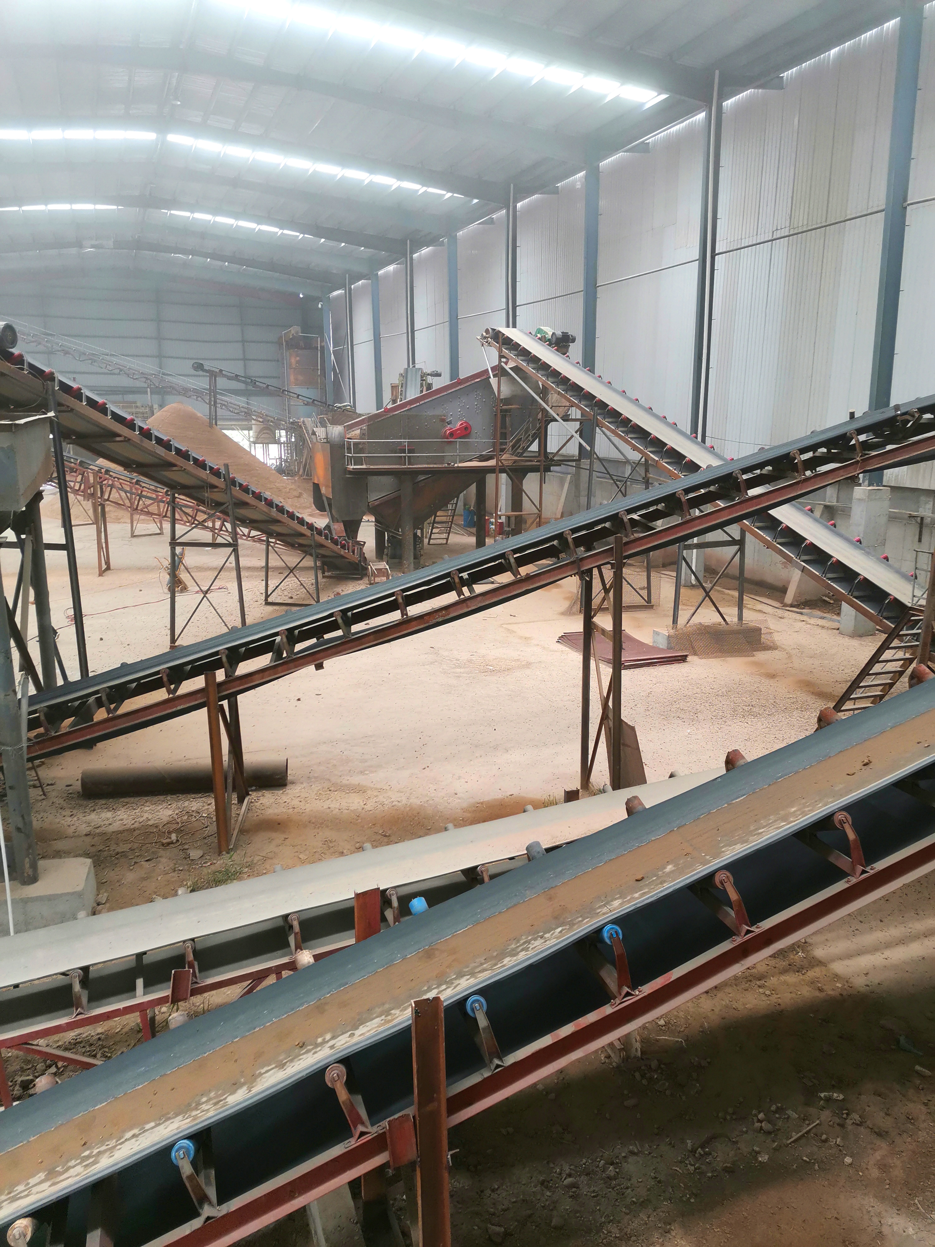 1.鵝卵石原料由給料機輸送到顎式破碎機進行粗碎,其中給料機在喂料過程中篩出可直接制砂的原料。